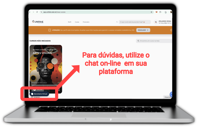 Para falar com o suporte, basta acessar sua plataforma e clicar em Secretária Virtual.