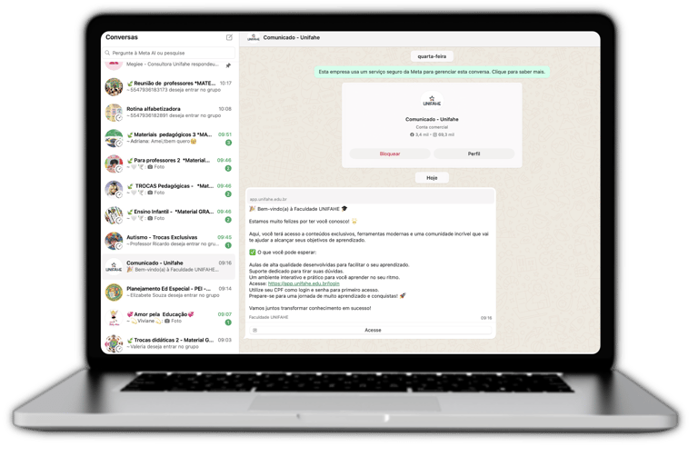 Você receberá os dados de acesso enviados pelo(a) consultor(a) e também pelo contato automático da Faculdade Unifahe através do Whatsapp.